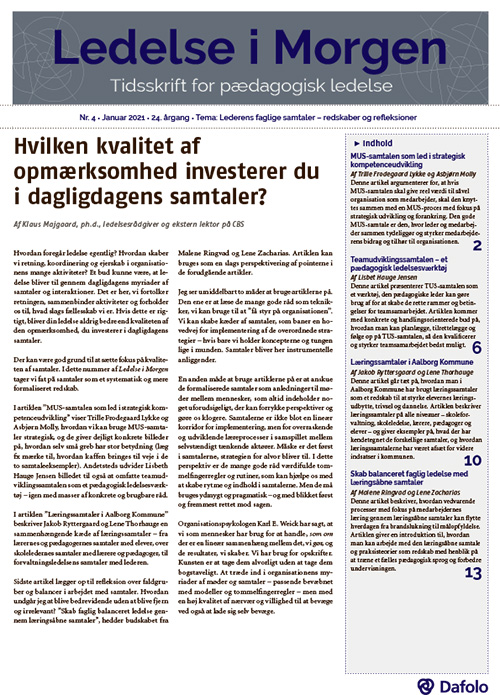 I den tredje artikel går vi tæt på praksis, når Jakob Ryttersgaard og Lene Thorhauge beskriver, hvordan man i Aalborg Kommune har brugt læringssamtaler som et redskab til at styrke elevernes læringsudbytte, trivsel og dannelse. Sidste artikel lægger op til refleksion over faldgruber og balancer i arbejdet med faglige samtaler. Her beskriver Malene Ringvad og Lene Zacharias, hvordan vedvarende processer med medarbejdernes læring gennem læringsåbne samtaler kan flytte hverdagen fra brandslukning til målopfyldelse.